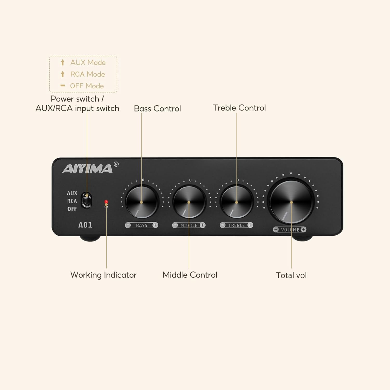 High power output: AIYIMA A01 Class D 2.0/2.1 Channel amplifier can support the maximum output power of 4 ohm speakers 100Wx2, equipped with 24V4A power supply.
