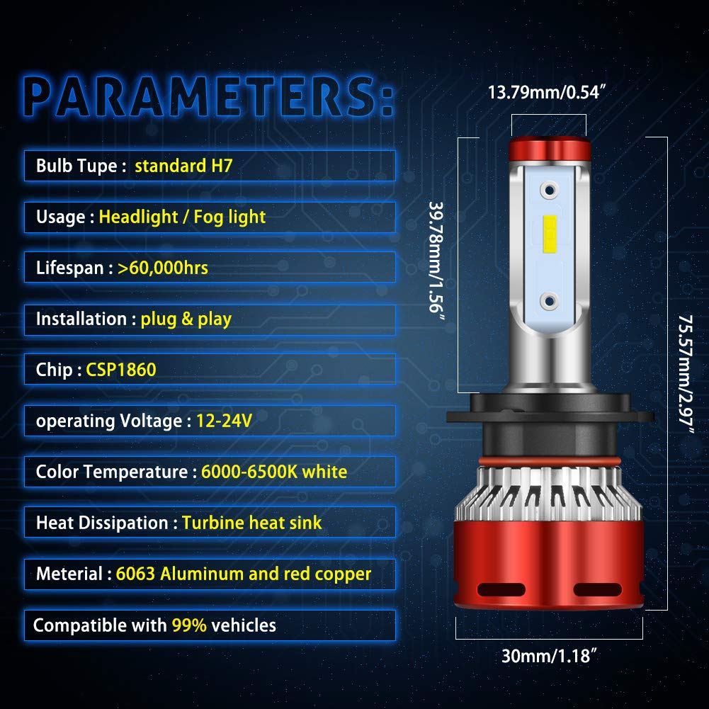 H7 Led Headlight Bulbs(Pack of 2)Color Temperature: 6500K Xenon White.Operate at 60W(30W per bulb).Operating Voltage:DC 11-30V(fit 12V, 24V vehicles).12000 Lumens Output(6000Lms per bulb).High Lumens and Extremely Bright.